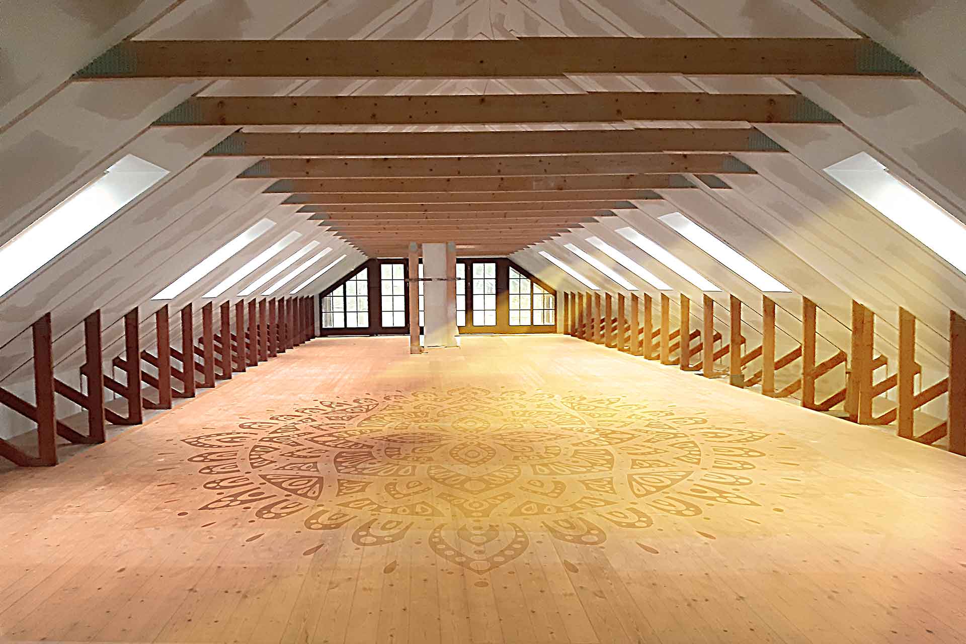 W Sukhavati znajduje się piękna minimalistyczna sala do jogi o powierzchni 220 m2 i jadalnia o powierzchni 100 m2.